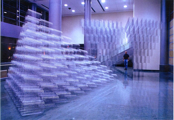 Mayer, a former professor of sculpture at Ohio University in Athens, Ohio, is known for his use of stacked industrial materials that creates elegant yet transient installations. In Enfilade he utilized a galvanized wire mesh with a one-inch grid as the basic building component. Transforming this simple material first into individual cylinders and then stacking them into triangular groupings of stepped pyramids, Mayer succeeds in creating a series of expanded forms that link together in an ethereal play of light and transparency defying their mass and scale.