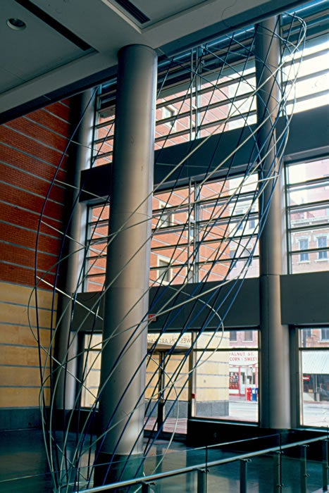 Woodham’s new sculpture represents several important steps in the artist’s career. It is his first piece to be completely designed on a computer screen before being modeled in real space. The computer model he used of the upper level of the Weston (made from construction drawings of the building) was his “most involved reconstruction of a proposed site to date.” Twister is also his first use of “conical screen structure” and marks a step away from the more geometric modular work of Woodham’s other permanent pieces in the Cincinnati area, such as those done for Cincinnati Gas & Electric Company in 1989 and 1990.